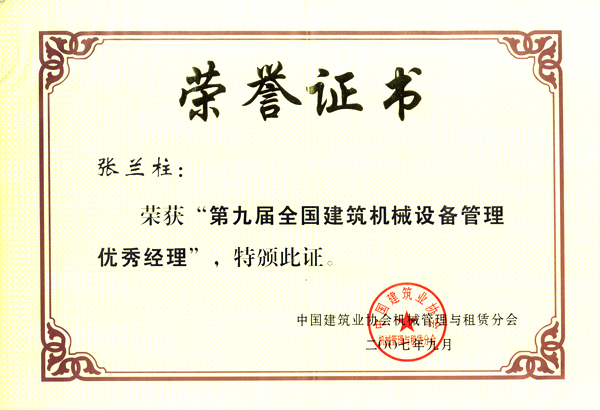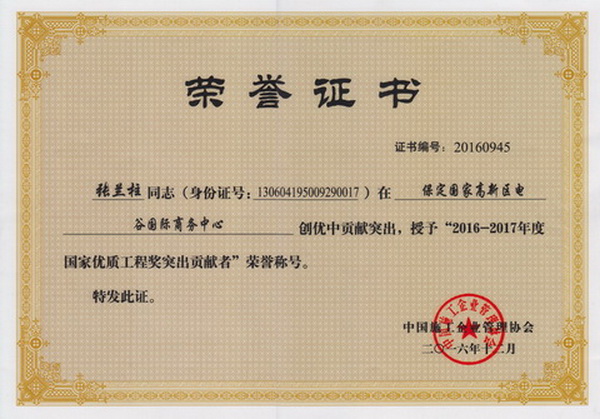 張?zhí)m柱同志以他杰出的工作業(yè)績(jī)被各級(jí)領(lǐng)導(dǎo)機(jī)關(guān)授予:全國(guó)、河北省、保定市建筑業(yè)優(yōu)秀企業(yè)經(jīng)理;優(yōu)秀企業(yè)家;優(yōu)秀共產(chǎn)黨員;優(yōu)秀黨務(wù)工作者;優(yōu)秀思想政治工作者;安全生產(chǎn)、工程質(zhì)量管理先進(jìn)個(gè)人;河北省優(yōu)秀經(jīng)理管理者;河北省建設(shè)系統(tǒng)勞動(dòng)模范;河北省勞動(dòng)模范等榮譽(yù)稱(chēng)號(hào)