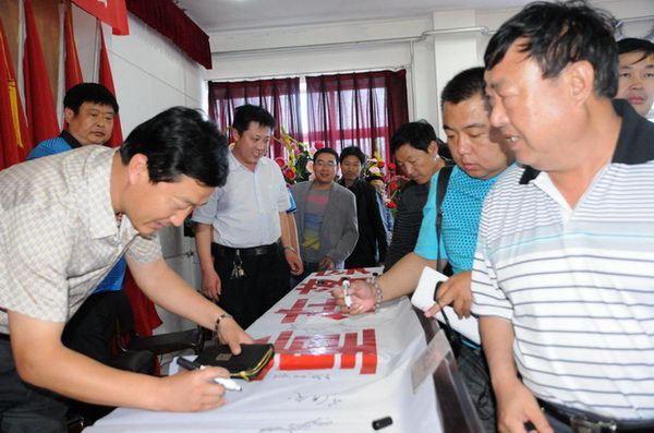 安監(jiān)站領(lǐng)導(dǎo)與董事長在安全宣傳標(biāo)語上簽名 |