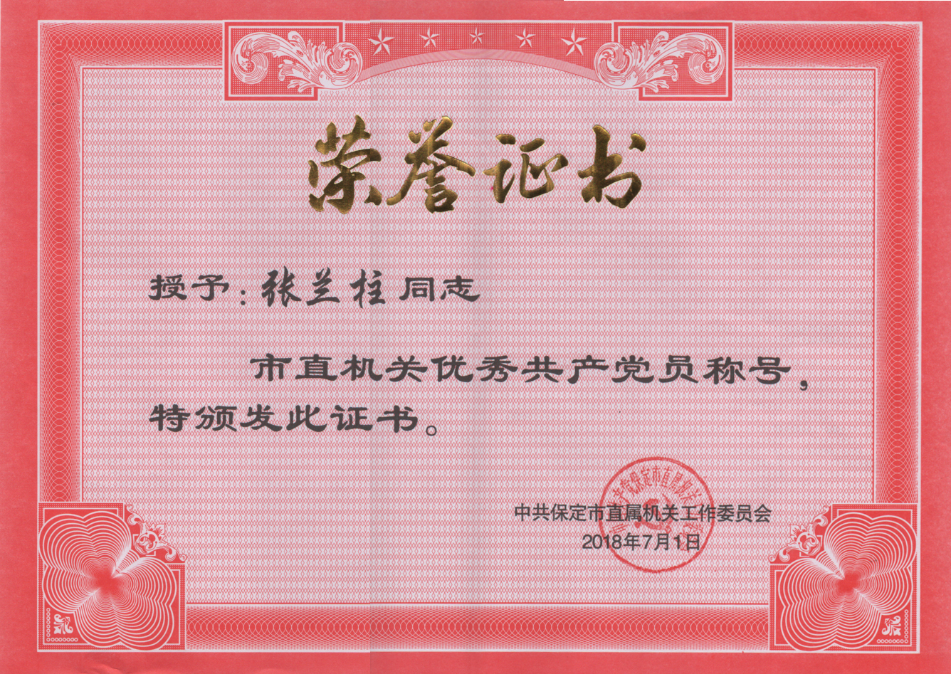 黨委書(shū)記張?zhí)m柱榮獲2017年度市直機(jī)關(guān)優(yōu)秀共產(chǎn)黨員榮譽(yù)稱(chēng)號(hào)